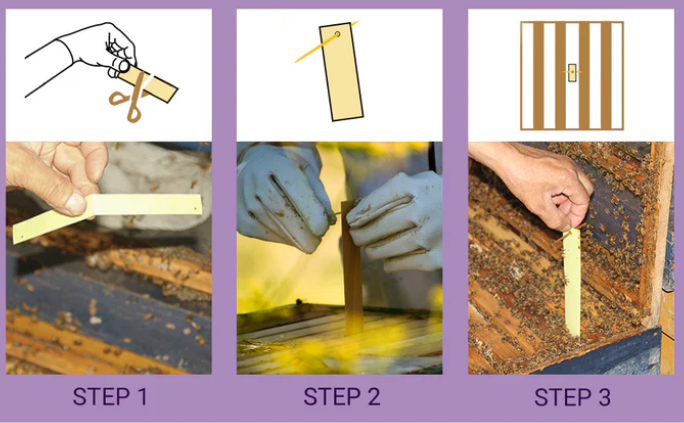 Use a 1/2 strip for 4 frame hive / Nuc, placed between brood frames