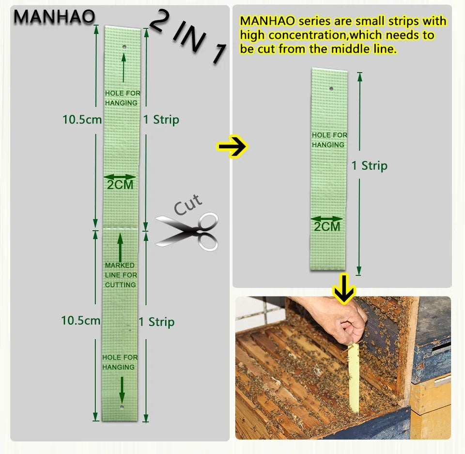 Manhao Pro consists of 40 high strength pieces which are to be cut in half to provide 80 strips for use. They then act as effectively as the other fluvalinate strips widely used for the control of Varroa mites.