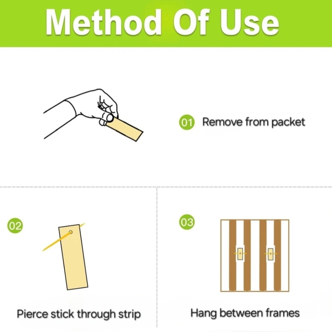 - For 8 - 12 frame hives hang 2 strips between frames in the brood chamber so they are within the path of the bees.
